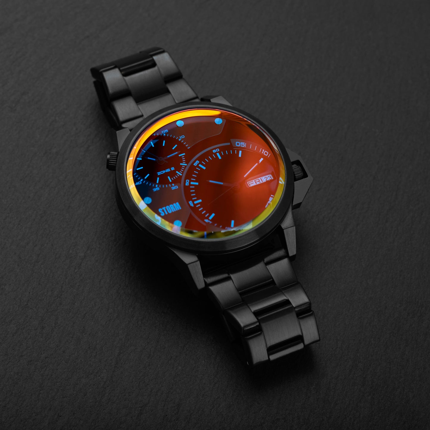 The STORM Avalonic is a bold and daring timepiece that is sure to get you noticed. This dual time watch features industrial detailing in a large case. The slate strap and case are made from stainless steel. It is water resistant to 50m and has a day/date feature.
