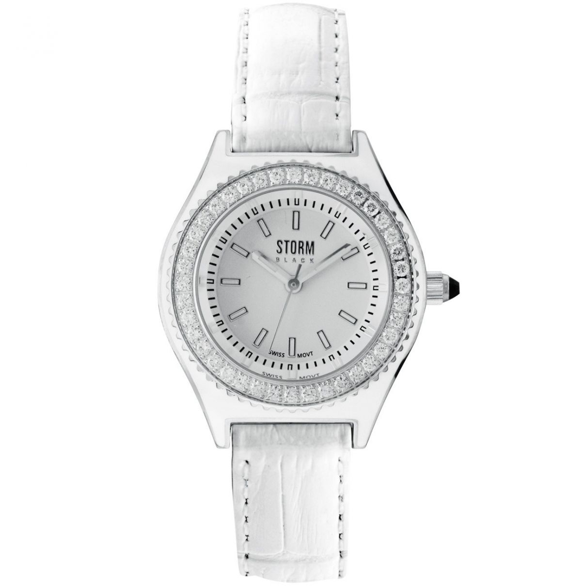 The STORM Diamond Kanti is from our premium STORM Black collection. This glamorous timepiece has a white leather strap and is made from highly polished stainless steel with a white face. The Diamond Kanti has a semi precious onyx stone on the crown, Swiss movement and scratch resistant sapphire glass. The main luxury of this watch is its 40 white diamond set bezel. This show stopping watch is also water proof to 50m.