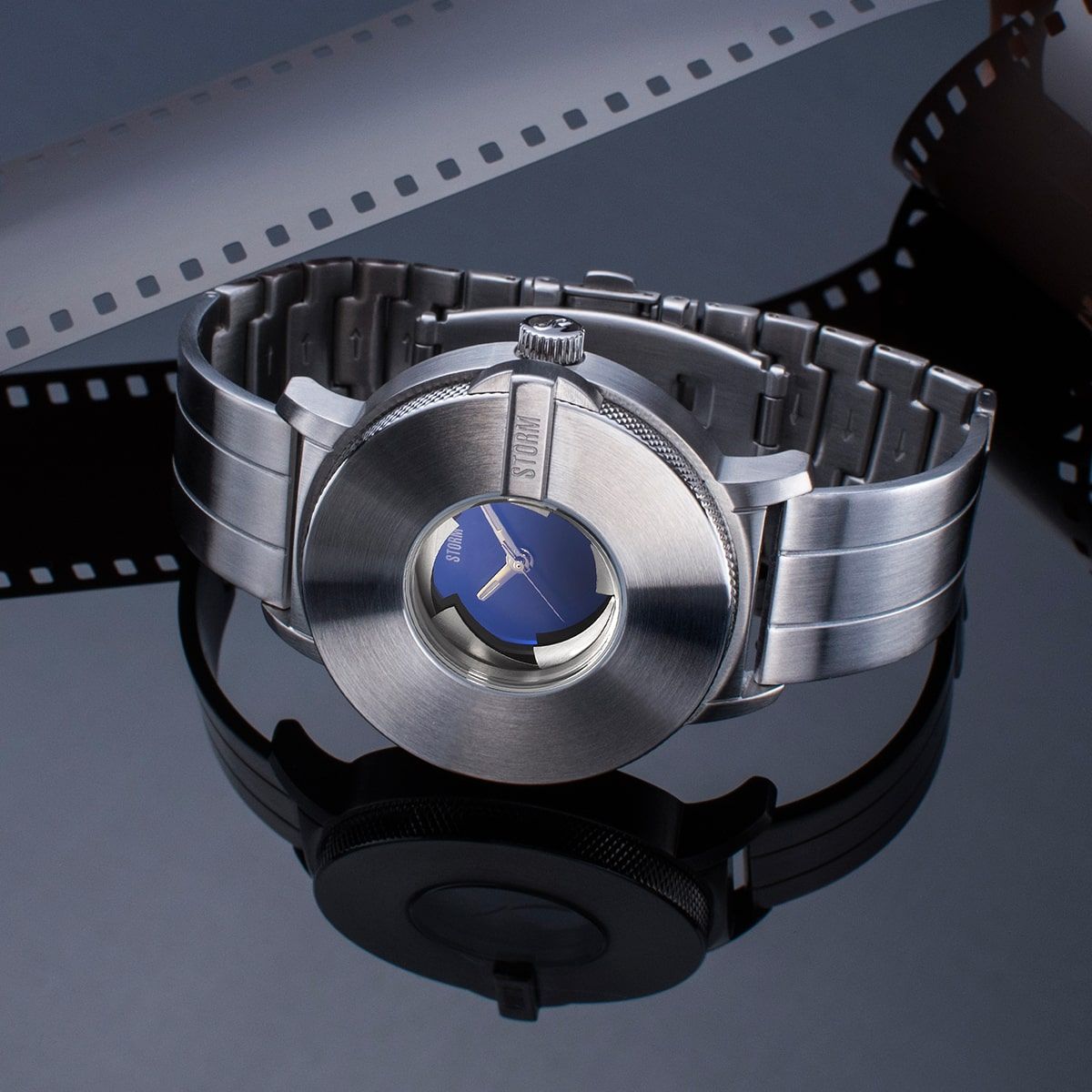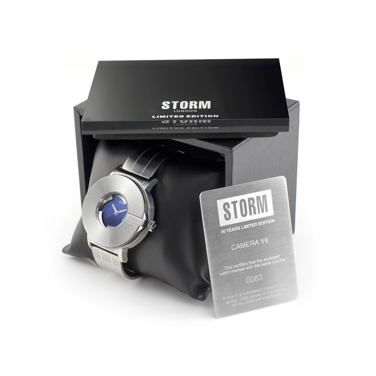 The Camera V6 celebrates STORM's 30th anniversary. Influenced by the first camera model that was released in 1995, the Camera V6 is an iconic statement that takes STORM fans and new customers on a journey through history. Inspired by the aperture of a camera, the Camera V6 features a shutter mechanism. By pushing the STORM logo at the 3 o'clock position anticlockwise, the entire watch bezel rotates, opening the shutter mechanism to reveal a minimalistic dial. The Camera V6 is finished with STORM's signature DX strap and an engine-turned finish on the bezel's side, creating a robust industrial design overall. The Camera V6 is presented with an etched serial number on a steel plate certificate that matches the case back of the watch. This number indicates one of a numbered Limited Edition series of 1000 pieces worldwide.