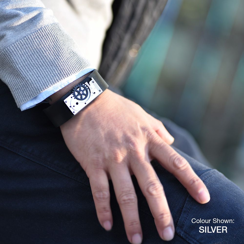 The STORM Coglow is a unique and trendy leather cuff bracelet with intricate cog detailing. Made from genuine leather and brushed stainless steel. Matching pendant available.