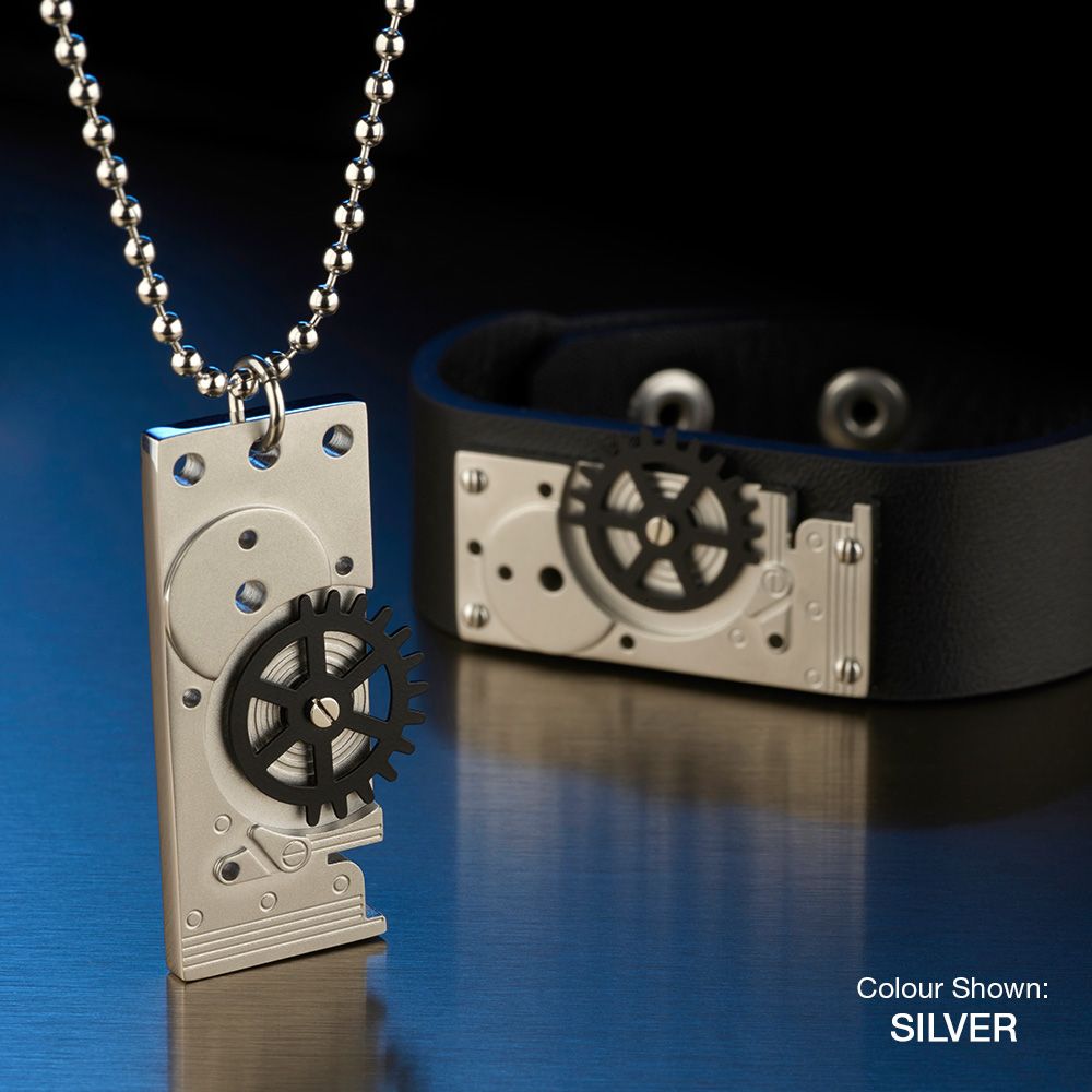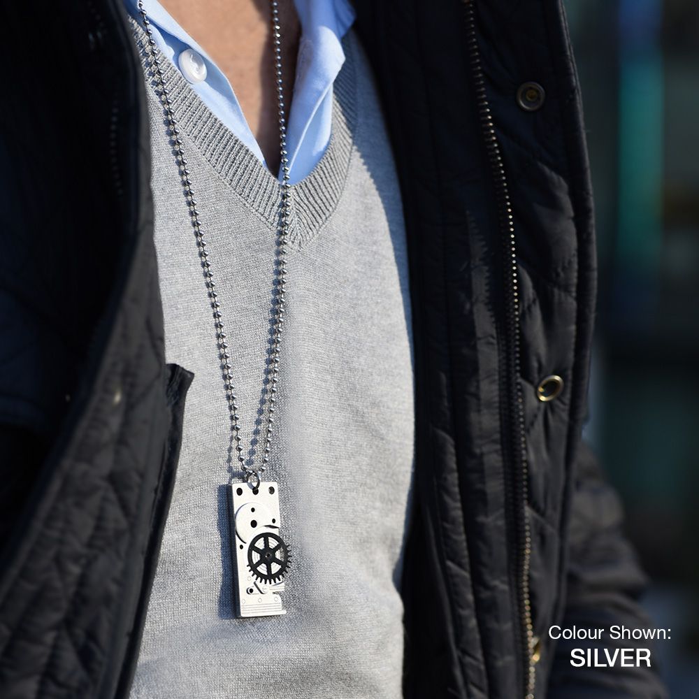 The STORM Coglow features a unique dog-tag style pendant with intricate cog detailing on a silver ball chain. Made from brushed stainless steel with slate ion plating. Matching bracelet available.