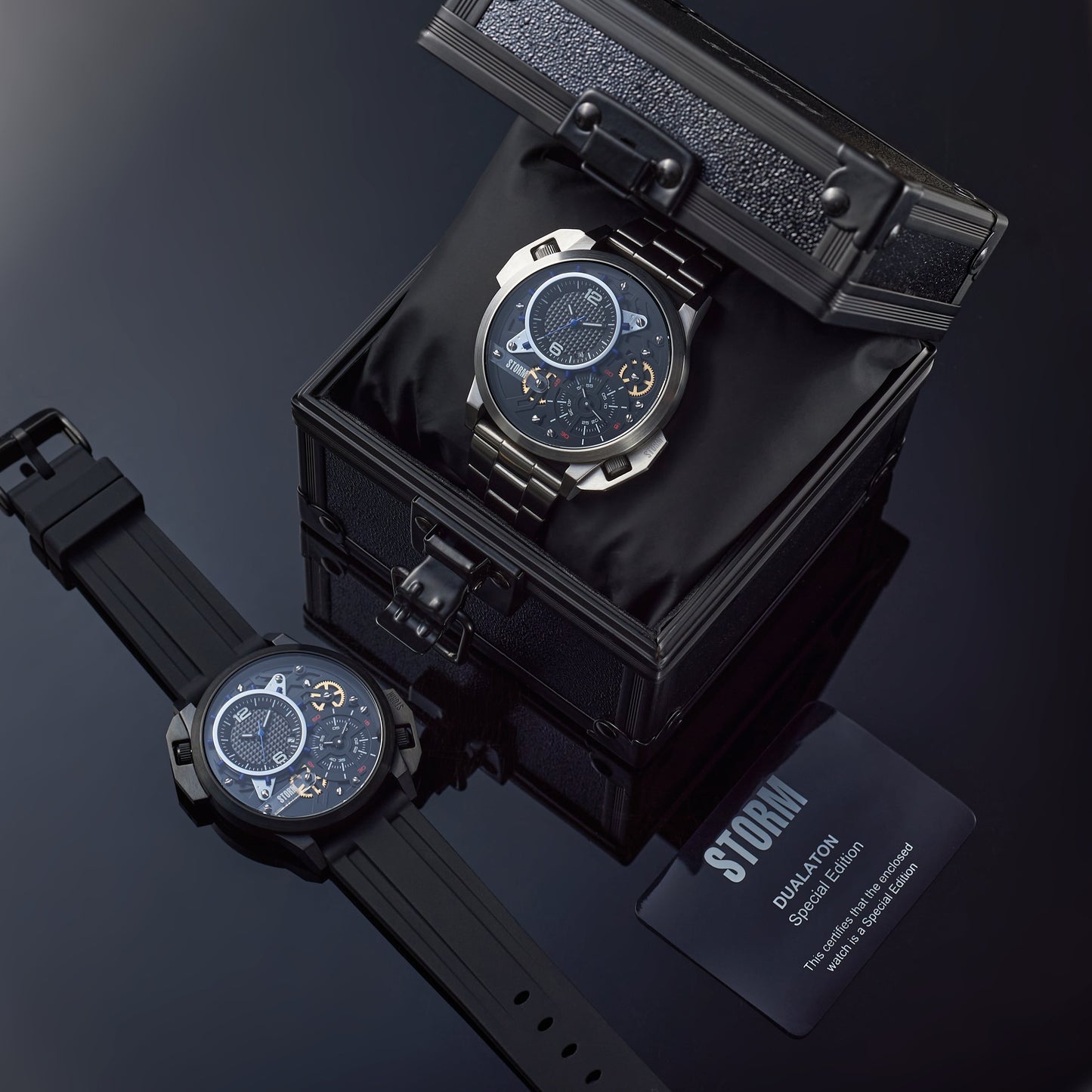 Each watch comes in a special edition box with a certificate of authenticity, underscoring its exclusivity and unique appeal. Elevate your wristwear game with the Dualaton Special Edition – where futuristic design meets unparalleled craftsmanship.