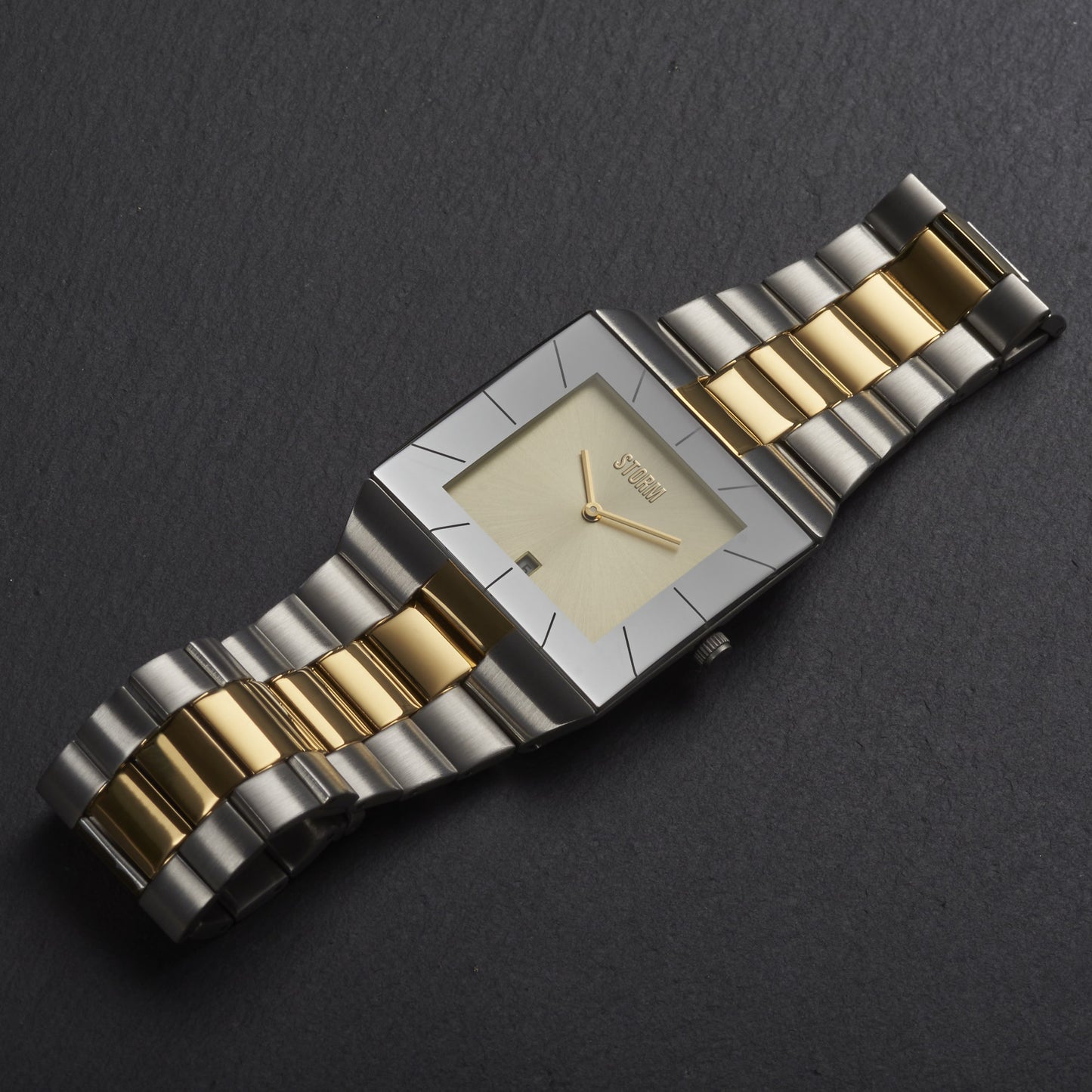The STORM Omari Grand, inspired by the Omari XL but featuring a larger case for an even bolder look, is a smart and stylish timepiece, perfect for everyday wear. The slim case and strap are crafted from brushed stainless steel with 21k gold plated links. The Omari Grand showcases a sleek, square gold dial with a minimalist design and a date feature.