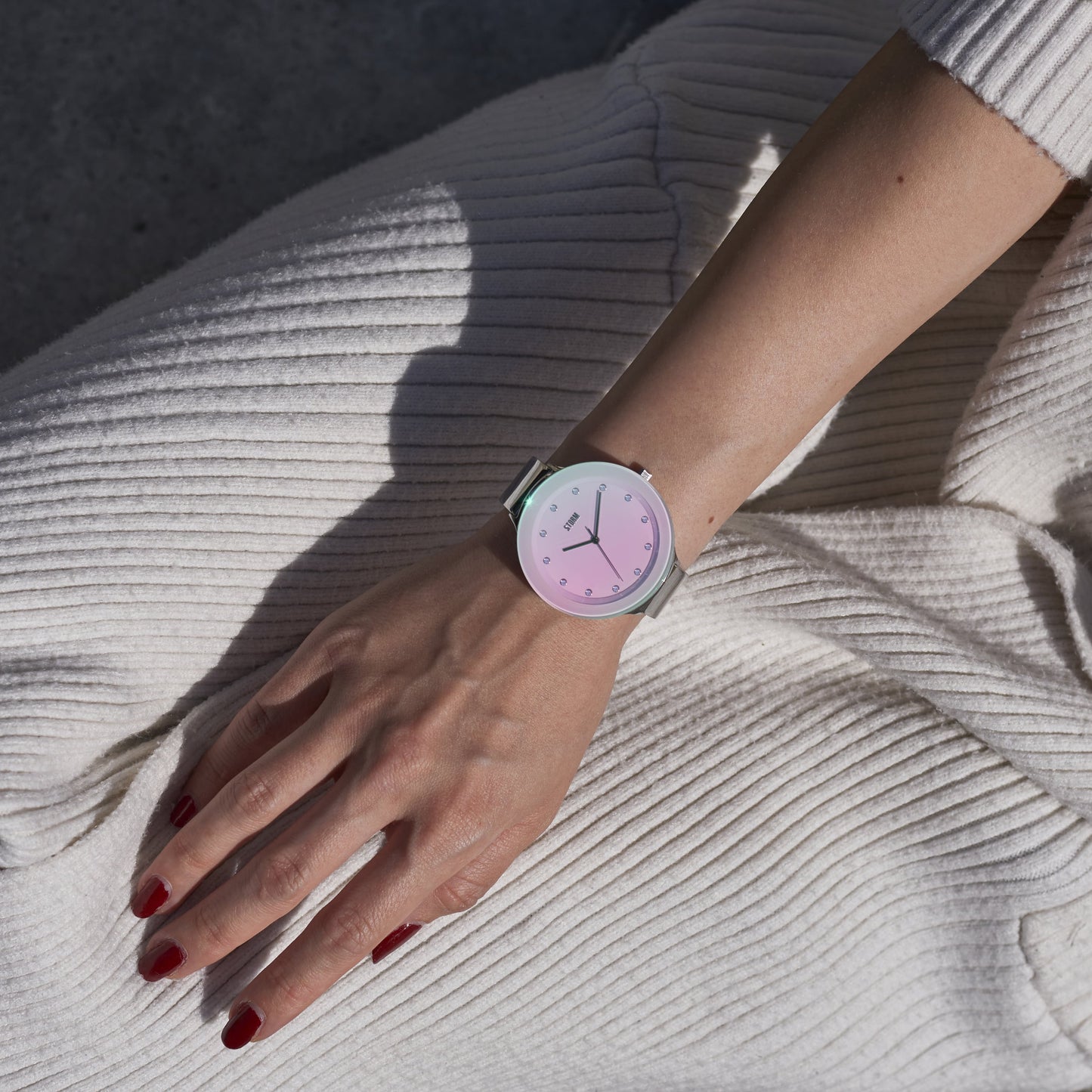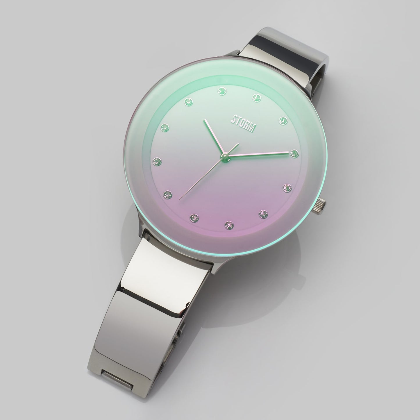 The STORM Ostele is a trendy watch with an oversized dial and highly polished strap. This slim watch has a lazer pink dial with large crystal number markers. * STORM's signature lazer pink glass is iridescent and may appear different shades of pink under different light.