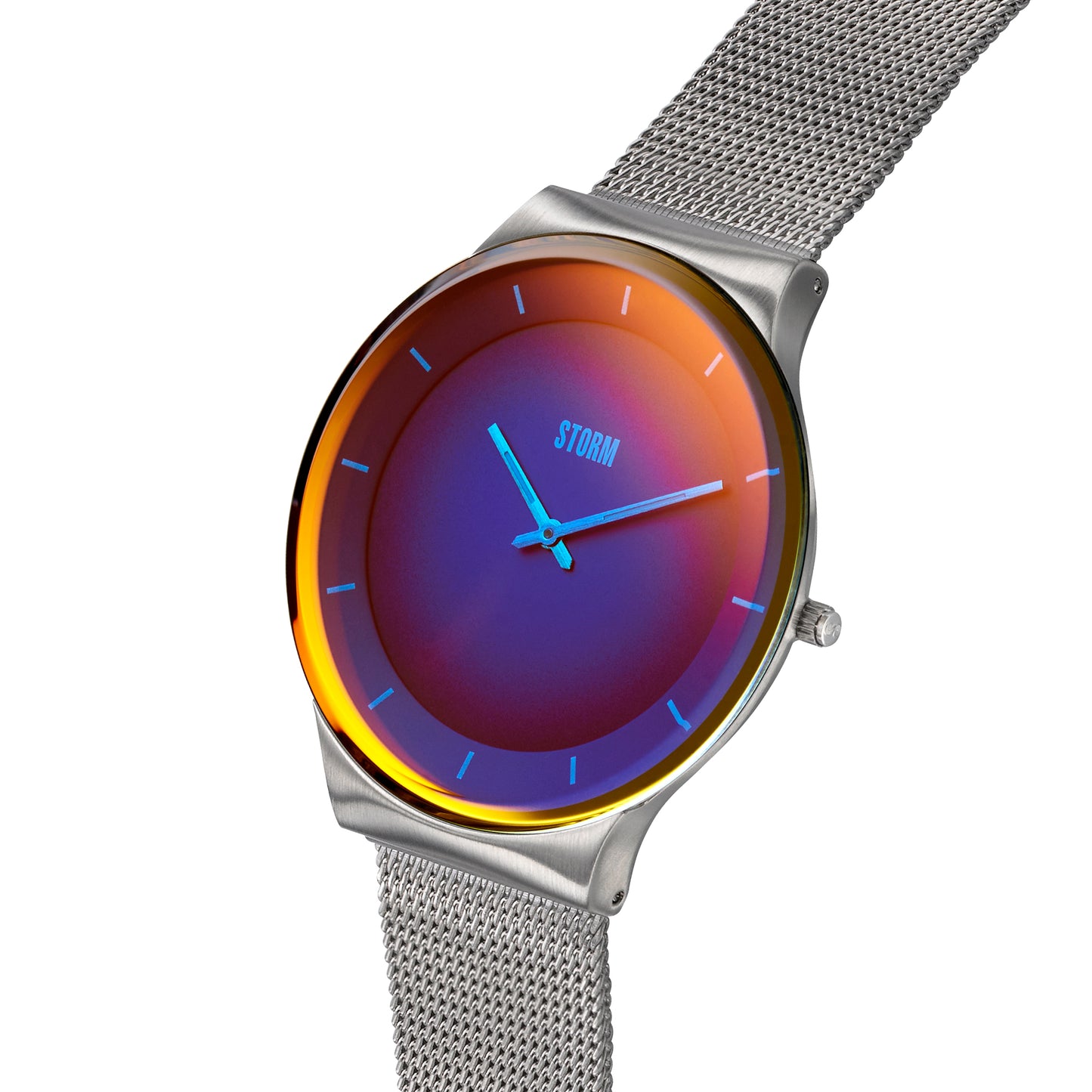 The STORM Pylo is a sleek, ultra-slim timepiece designed with a striking edge-to-edge glass face. Its graduated dial, crafted with innovative photochromic glass, shifts through a spectrum of vivid colors depending on the angle of light. This effect is achieved using our advanced lazer glass technology, ensuring dynamic color transitions under different lighting conditions. Complementing its modern aesthetic, the Pylo features a sophisticated mesh band and a brushed stainless steel finish, delivering a perfect blend of style and innovation.