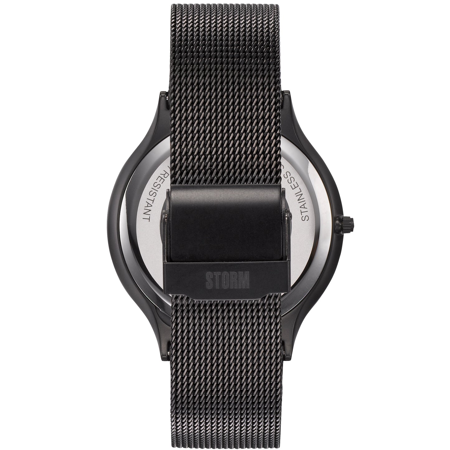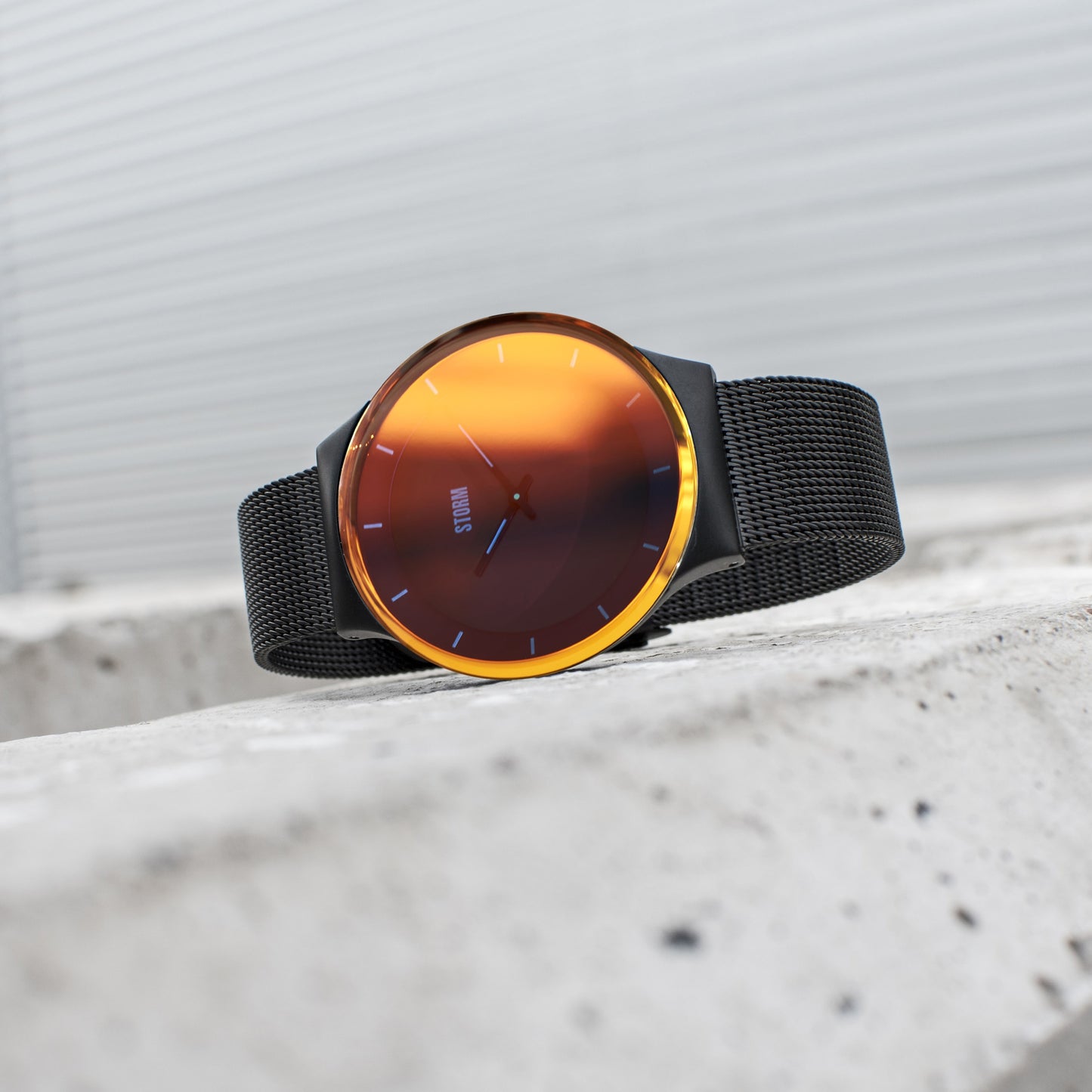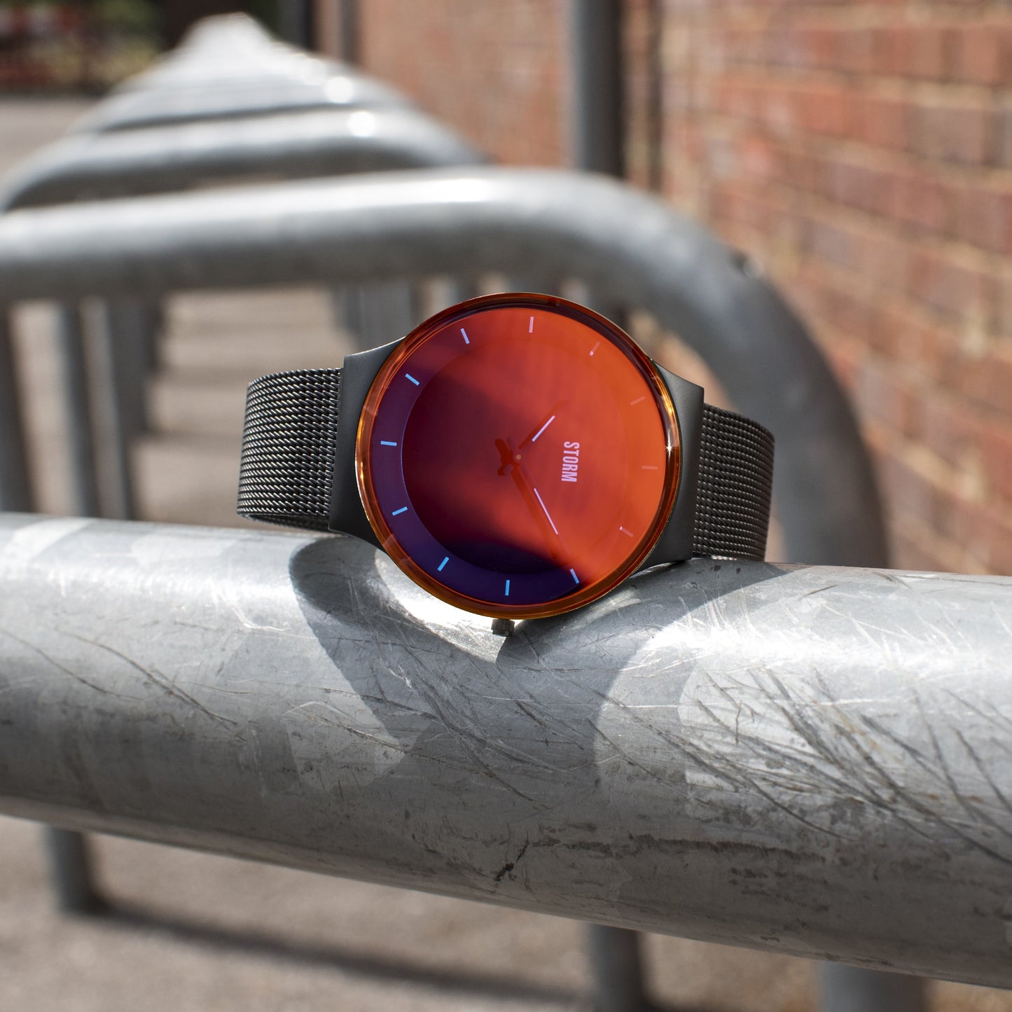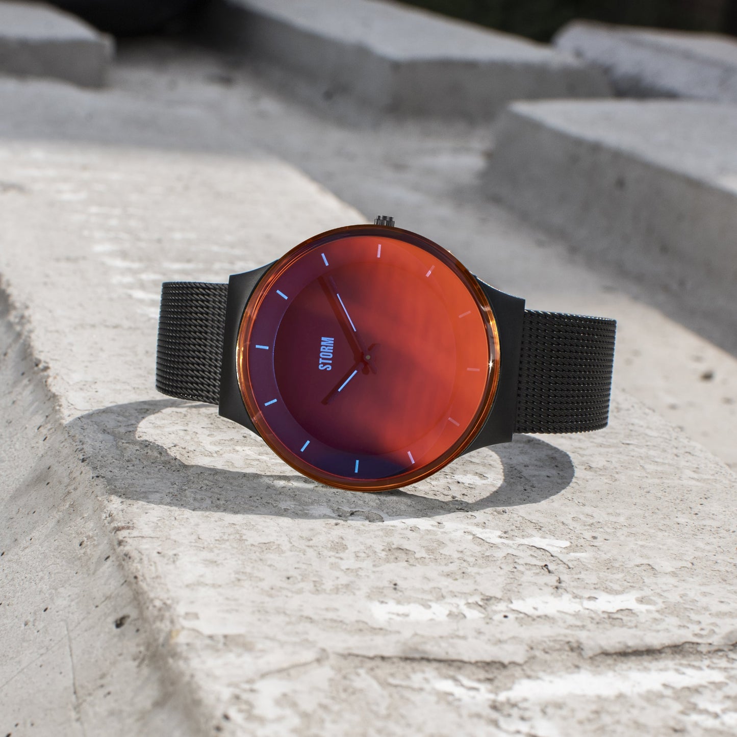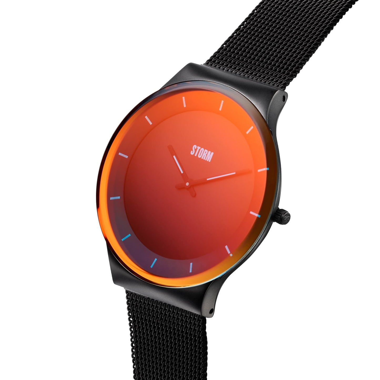 The STORM Pylo is a sleek, ultra-slim timepiece designed with a striking edge-to-edge glass face. Its graduated dial, crafted with innovative photochromic glass, shifts through a spectrum of vivid colors depending on the angle of light. This effect is achieved using our advanced lazer glass technology, ensuring dynamic color transitions under different lighting conditions. Complementing its modern aesthetic, the Pylo features a sophisticated mesh band and a matte black stainless steel finish, delivering a perfect blend of style and innovation.
