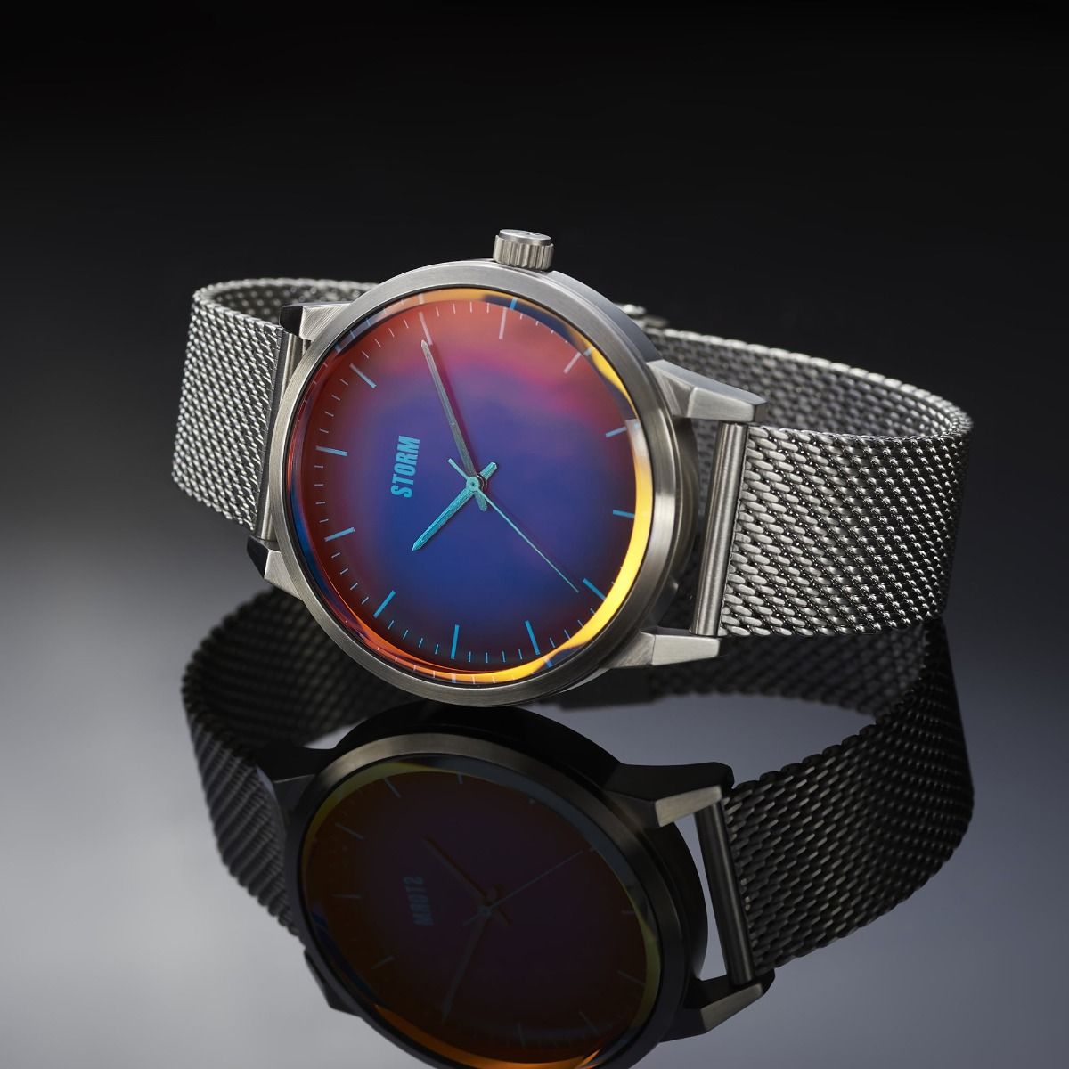 The STORM Styro is a classic looking watch with a modern twist. A stunning graduated dial in a range of intense colours features Photochromic glass. This technique stems from our laser glass technology and enables the dials to change colour at under different lighting. Styro is water resistant to 50m and features a thick mesh band made from brushed stainless steel.