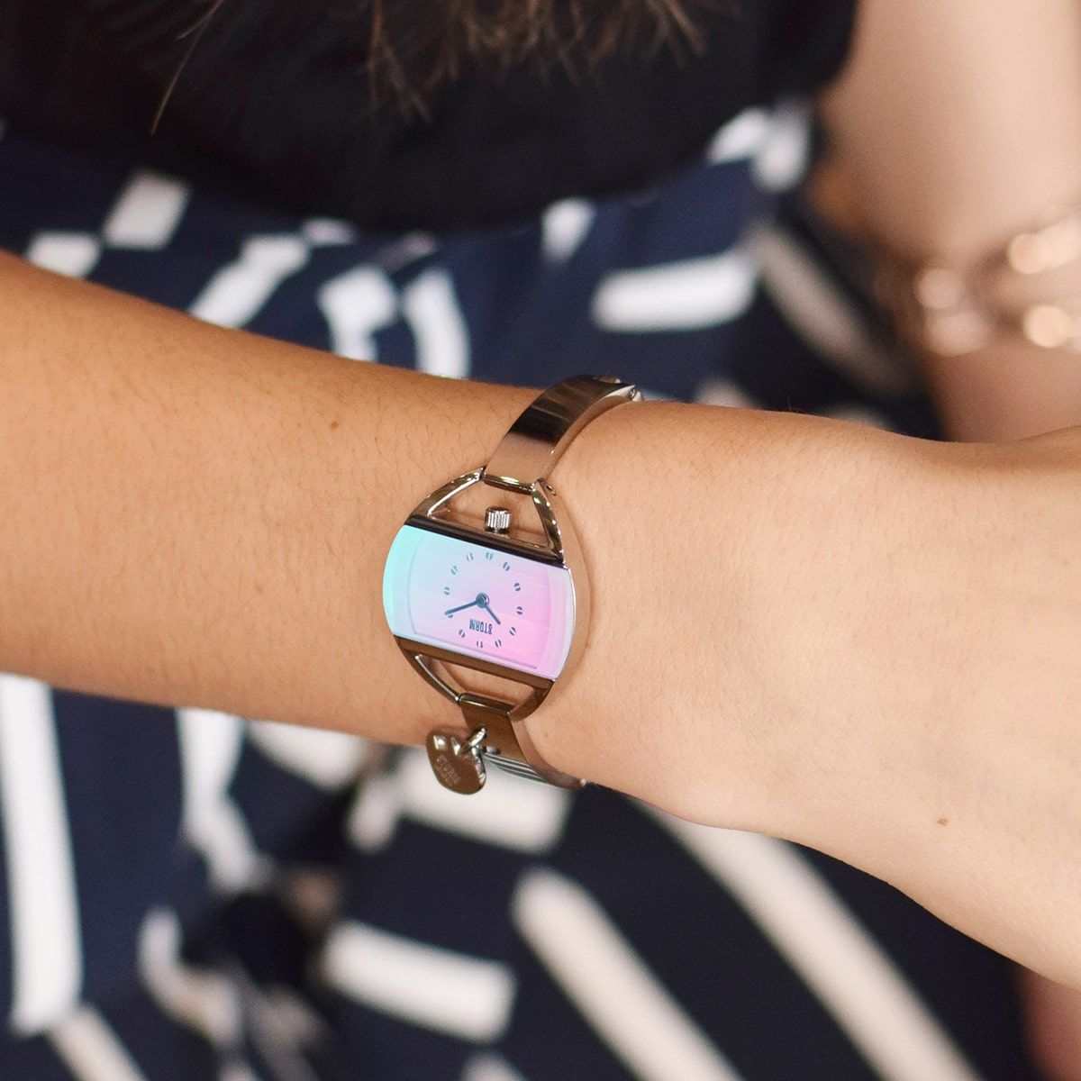 The Temptress Charm’s unique case is curved to fit neatly around your wrist, with a lazer pink edge to edge glass dial.
