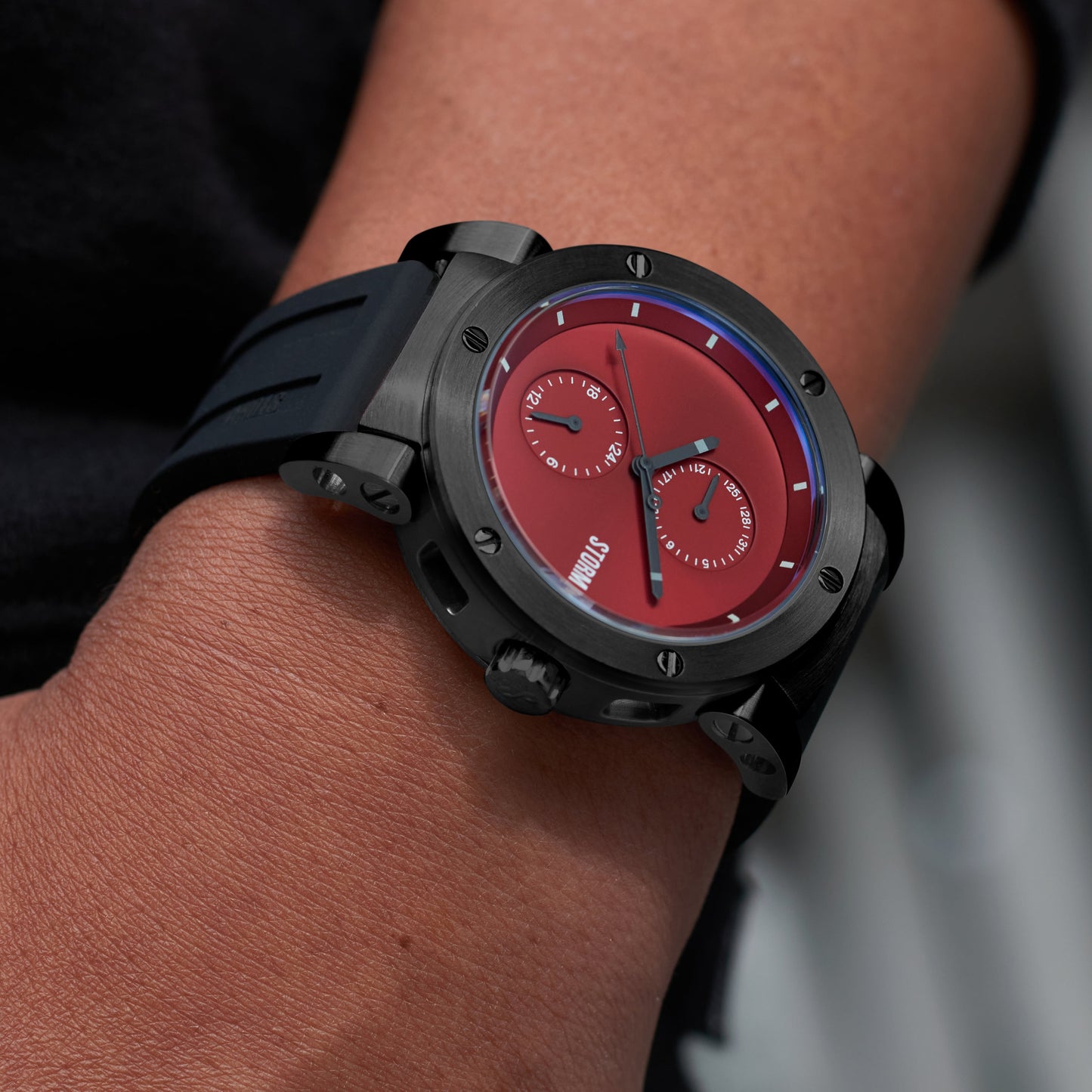 Hydron V2 is a durable men's watch in slate ion-plated stainless steel, finished around the bezel with screws at each of the 10-minuite markers. Its case is secured with sturdy shoulders and its face is strong mineral glass. The sunray red dial features minimal markings and two vertically stacked date and 24hr time functions. This open case design is 50m water resistant.