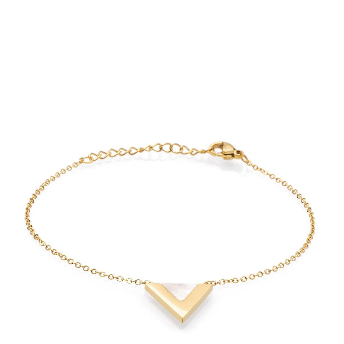A delicate bracelet with a knotted triangular pendant, which is decorated with genuine mother-of-pearl. Stainless steel plated with 21k gold. Length 16.5-19.5 cm