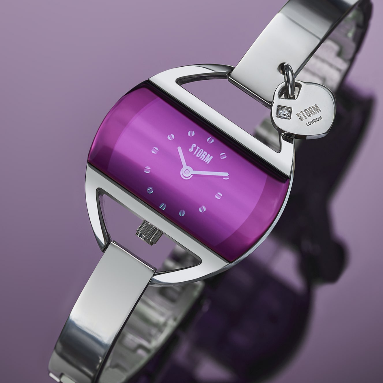 The STORM Temptress Charm is one of our best selling ladies watches. The watch is curved to fit neatly around your wrist with lazer purple glass dial and a cute heart charm, accented with a single crystal. The Temptress charm is made from polished stainless steel and has easilink fastening meaning it can be easily self adjusted to fit your size. Be unique! *STORM's signature lazer glass is iridescent and may appear as different shades under different lighting conditions.